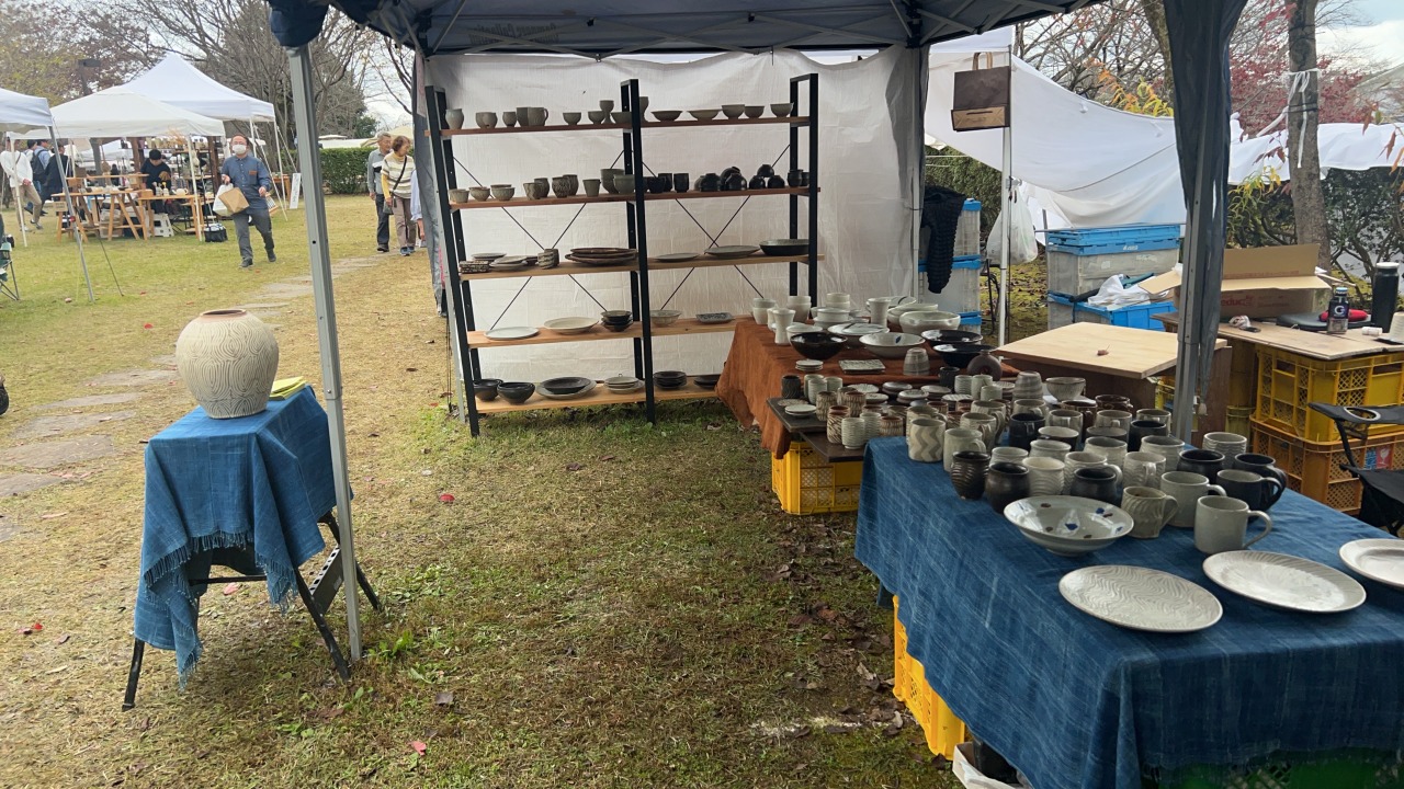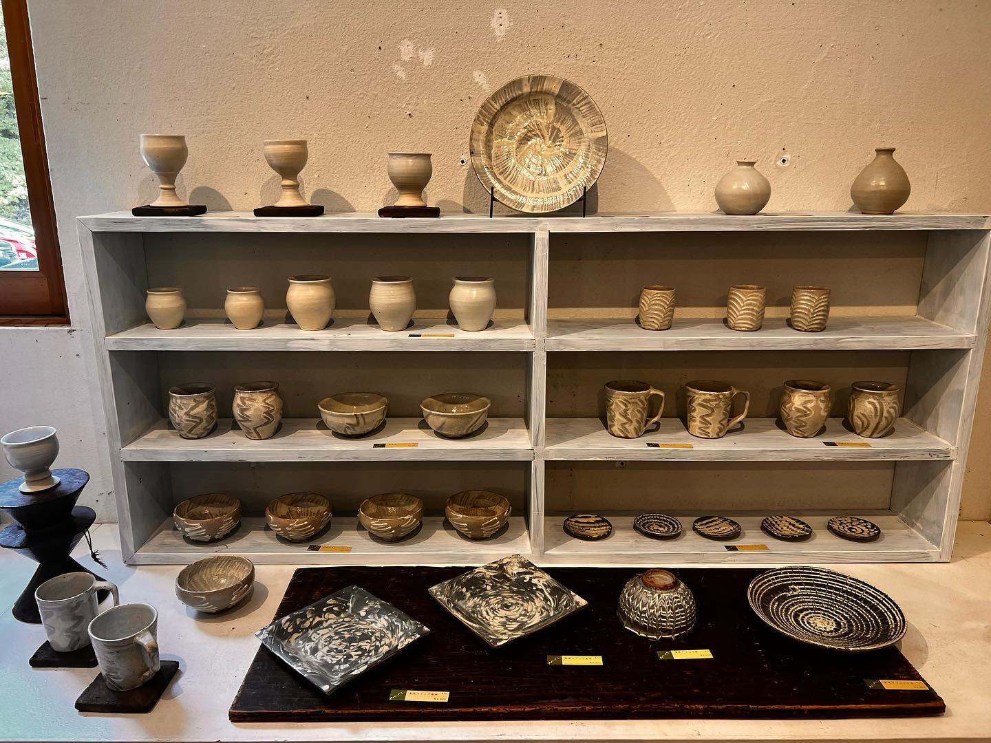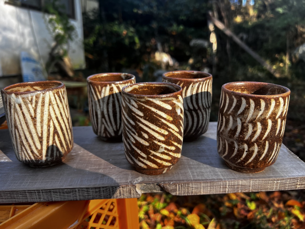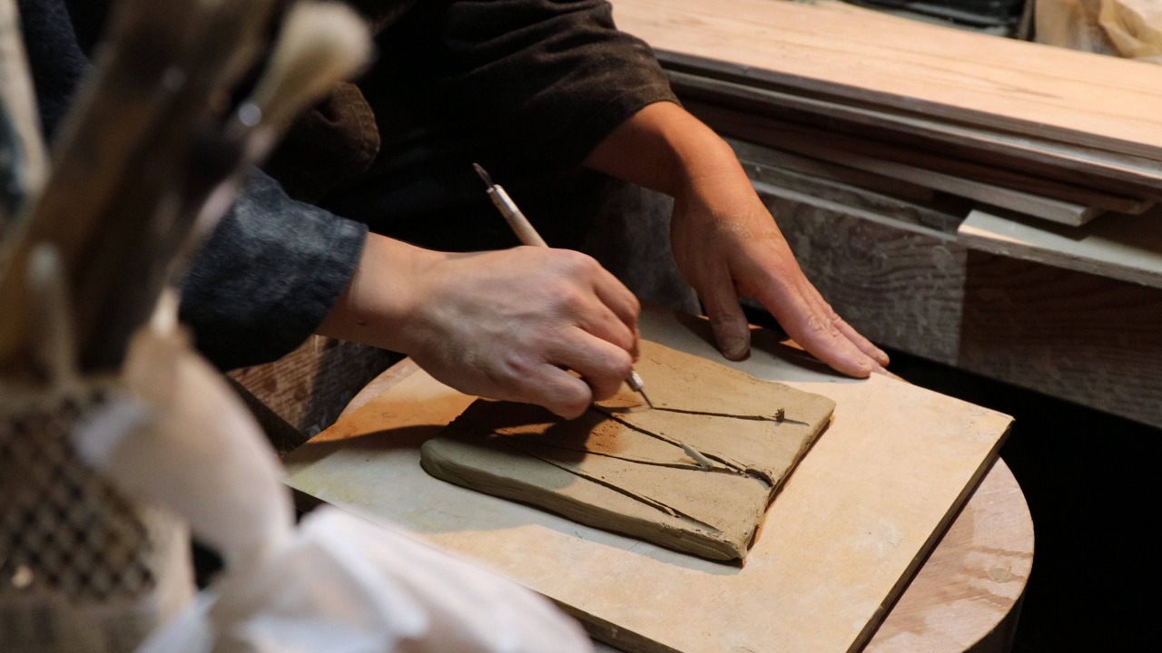 私の代表的な技法は象嵌です。この象嵌を駆使し、原材料もなるべく益子産にこだわり、益子の原始人として活動しております。象嵌とは、ベースになるものに別の物を埋め込む技法で、焼き物だけでなく木工などにも使われる技法です。器に思いついたまま、下書きもせず模様を彫り、白泥を埋め、削り出す作業時に模様の見え方が違うのが1番の楽しみでもあり、創り手のみぞ知る情景とニヤニヤしながら日々作陶しております。