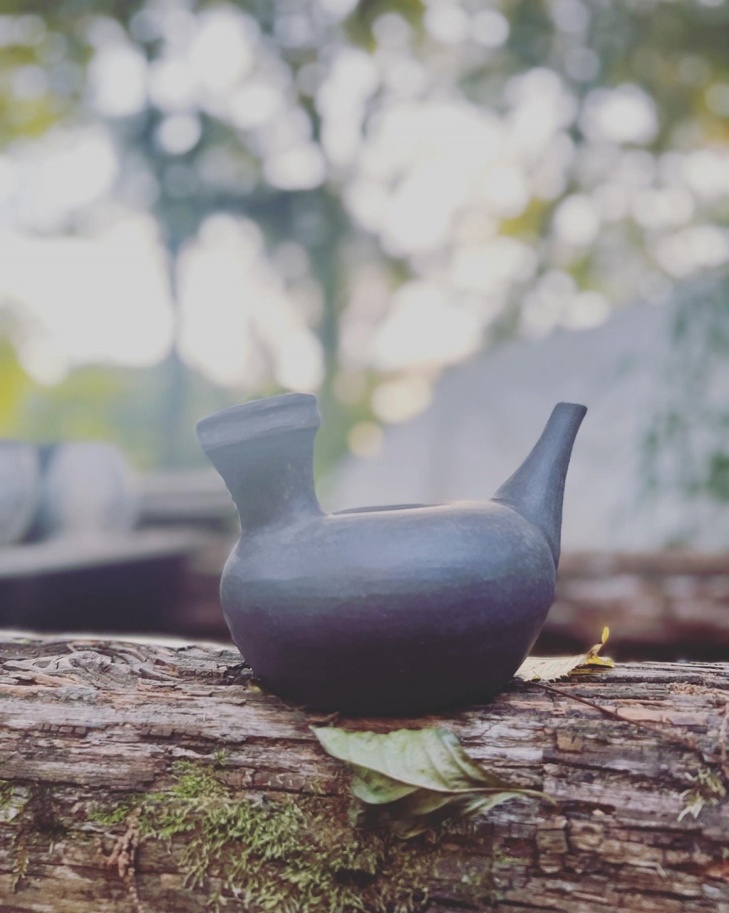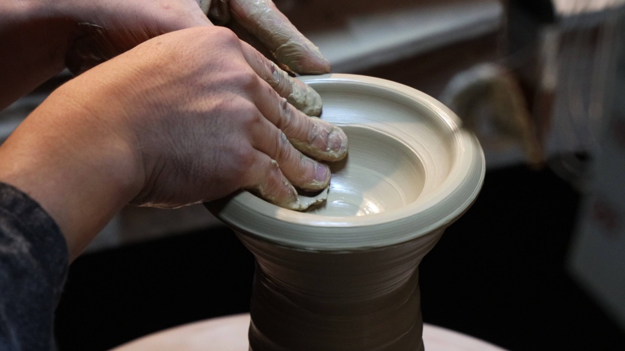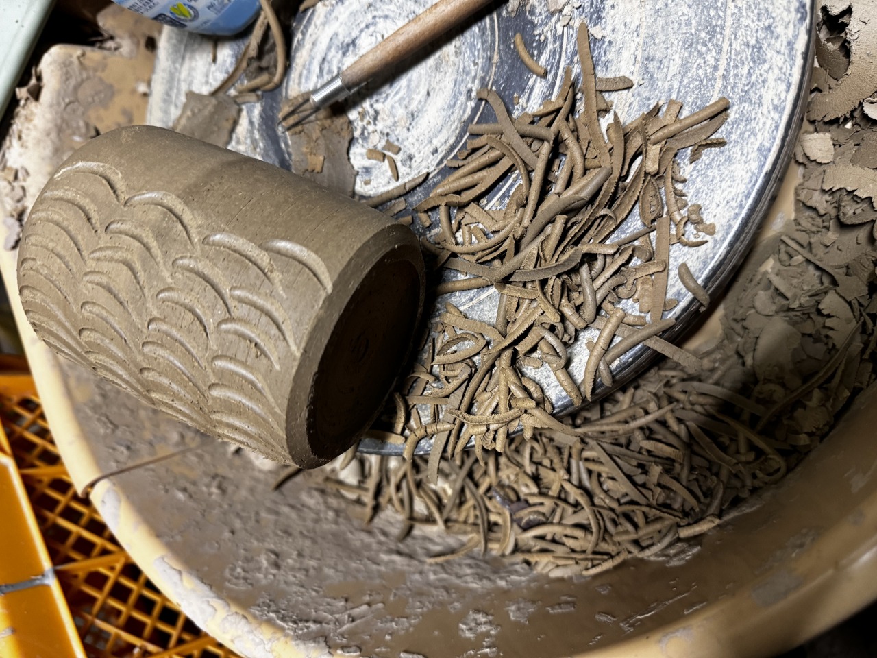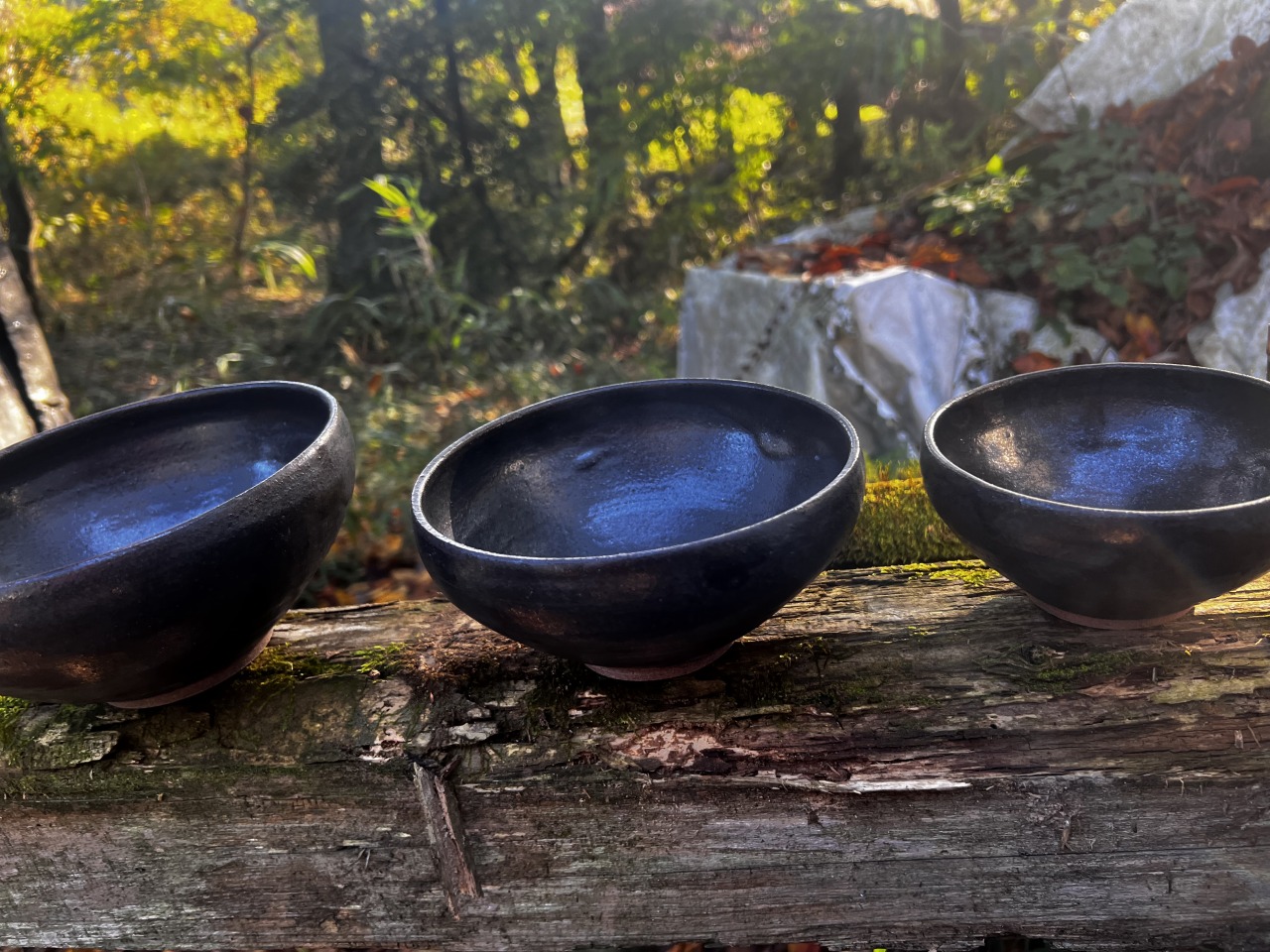 私の代表的な技法は象嵌です。この象嵌を駆使し、原材料もなるべく益子産にこだわり、益子の原始人として活動しております。象嵌とは、ベースになるものに別の物を埋め込む技法で、焼き物だけでなく木工などにも使われる技法です。器に思いついたまま、下書きもせず模様を彫り、白泥を埋め、削り出す作業時に模様の見え方が違うのが1番の楽しみでもあり、創り手のみぞ知る情景とニヤニヤしながら日々作陶しております。